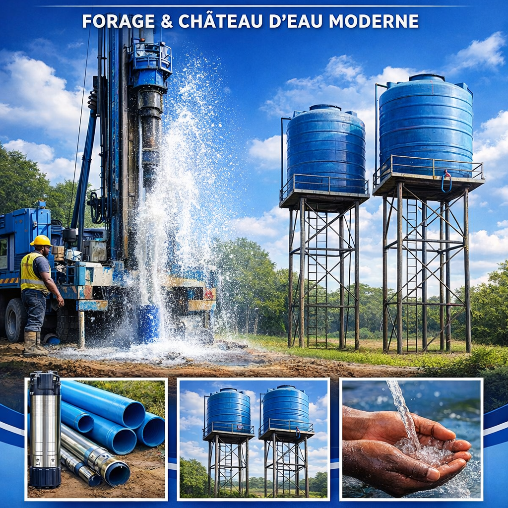 Fournir un accès constant à l’eau potable pour des villages entiers grâce à des systèmes de forage à château d’eau.